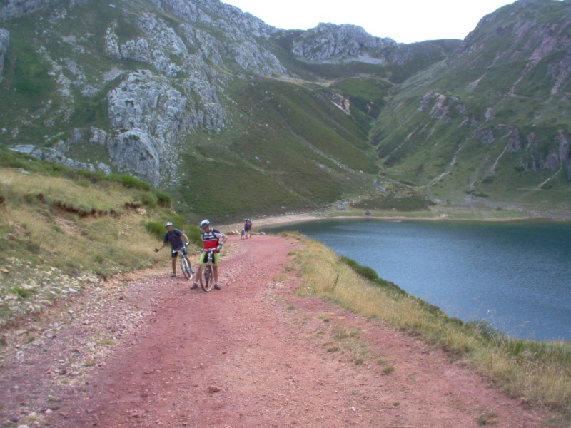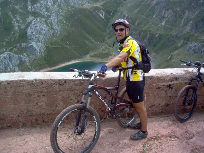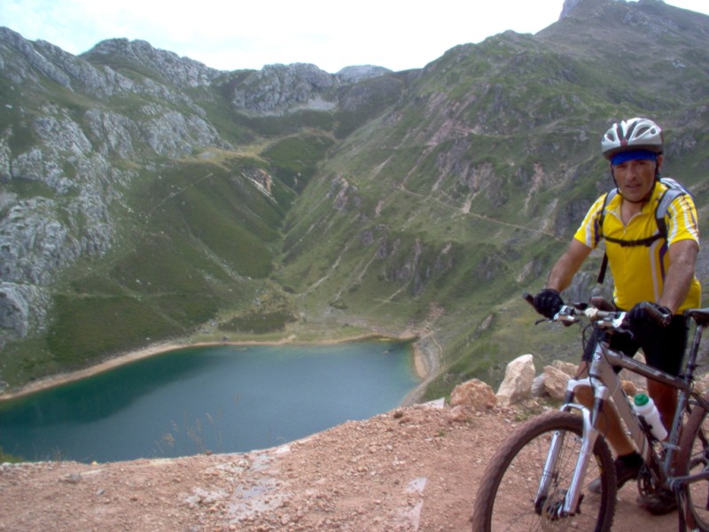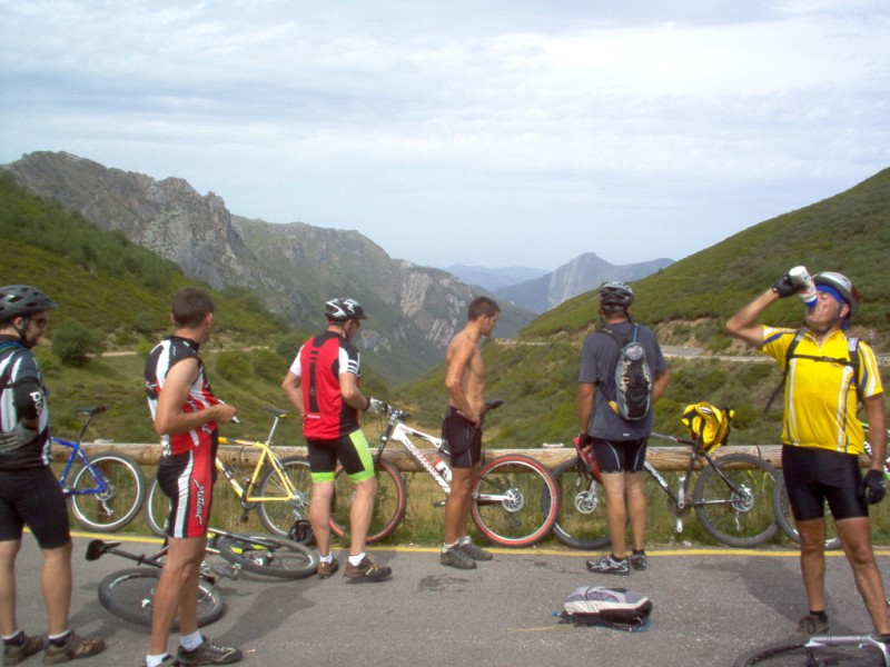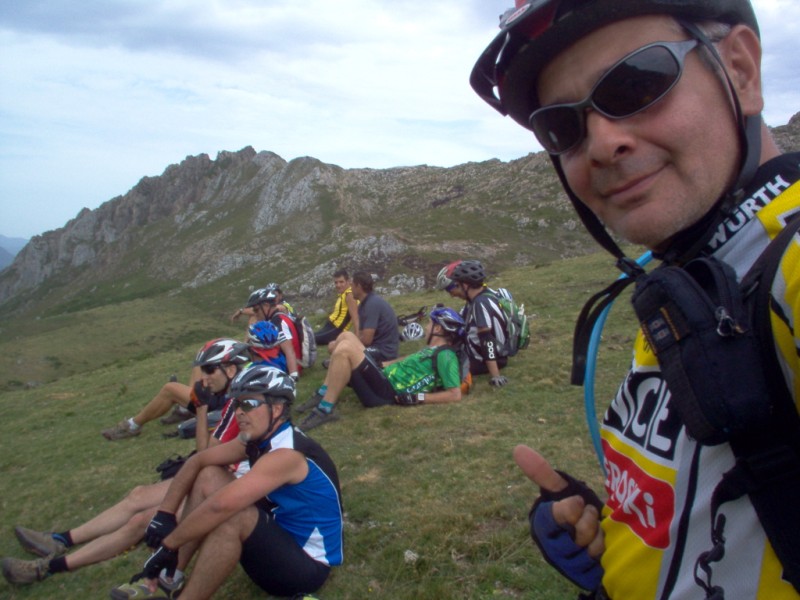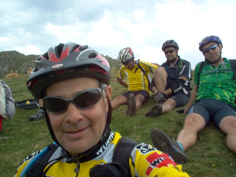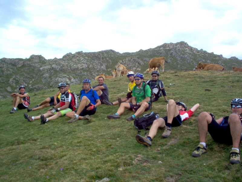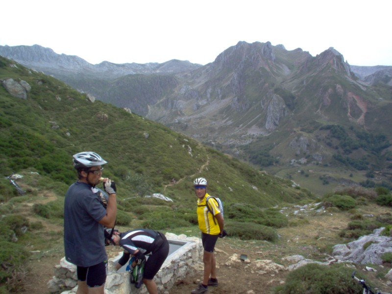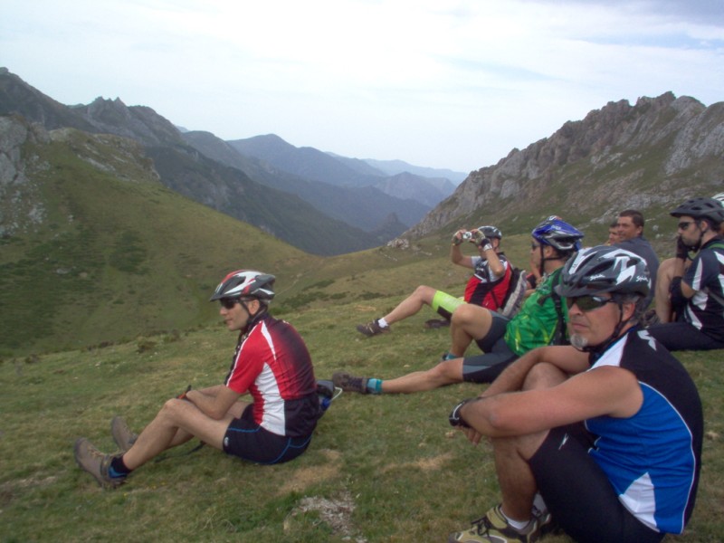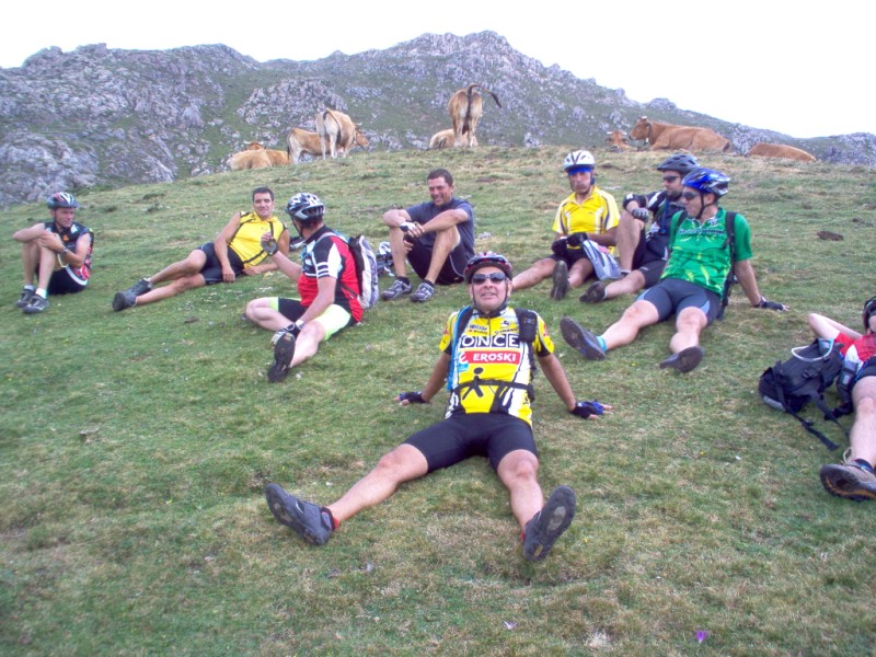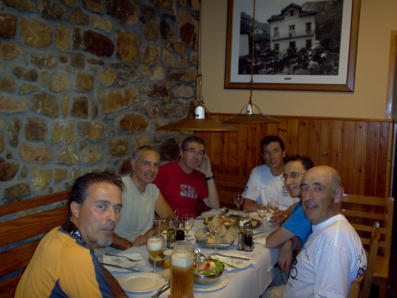 Una vez coronado el puerto continuamos ruta por caminos y senderos contemplando los lagos y las espectaculares laderas y picos, cruzándonos y adelantando a multitud de senderistas. Curradísimo el trabajo de los reporteros José Ignacio y José Palomo. Como final de ruta y para reponer fuerzas, que no sólo de pedalear vive el hombre, en Pola de Somiedo nos metimos entre pecho y espalda una sidra y unas fabes.